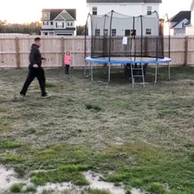 A young girl carelessly swings a golf club on the front yard and hits her father in the groin with it. The man falls over in pain. Security footage.