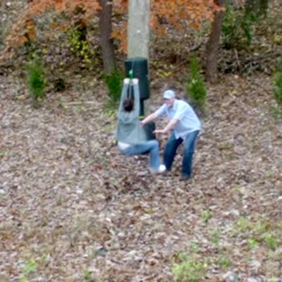 A man pushes a woman on a swing-set in a yard, as a young girl screams when the swing-set stars to shake and wobble. The woman then pushes the man over with her feet which sends him in the air and down to the yard, knocking over the camera. Video rotates sideways. (:52)