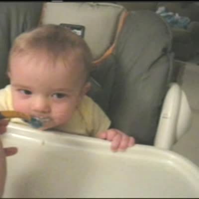 Baby boy makes a funny growling noise when he eats his breakfast oatmeal. First foods.