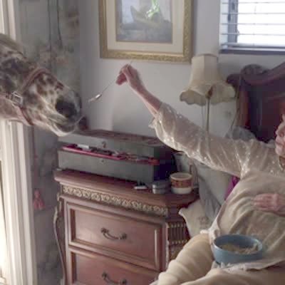 A senior woman feeds her horse oatmeal from her bed as the horse sticks its head through the bedroom door way.