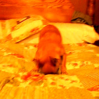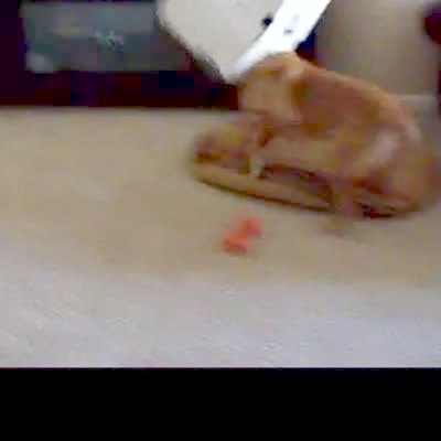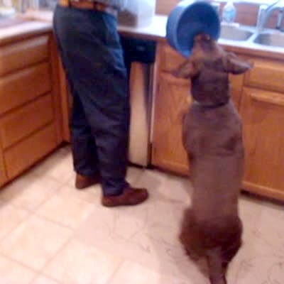 Cute big brown dog fetches her food bowl and jumps up and down while man puts food in her bowl. She obeys all commands.