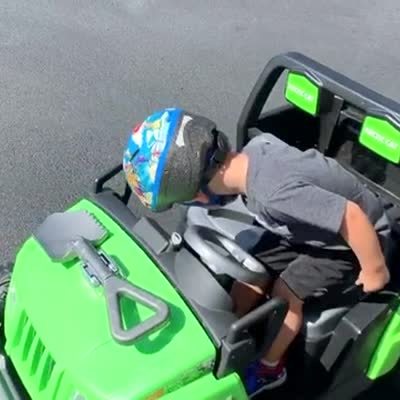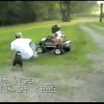 A man tells a tot boy not to drive his toy Jeep to the other side of the house, and the boy immediately drives over to the other side of the house.