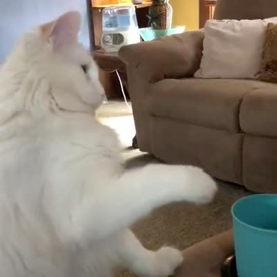 A cat sits on a couch and reaches his paw into a cup. A man and a woman tell him no repeatedly and he retracts his paw but tries to reach into the cup again repeatedly and they laugh.