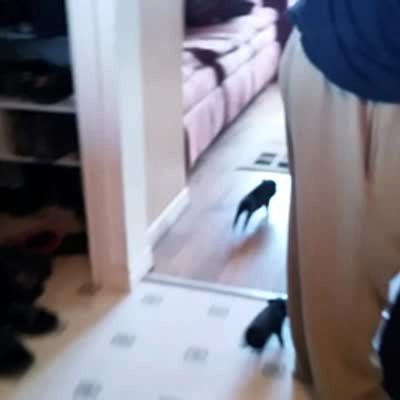 Several little piglet pigs run to their room and hop in bed when a woman tells them to.