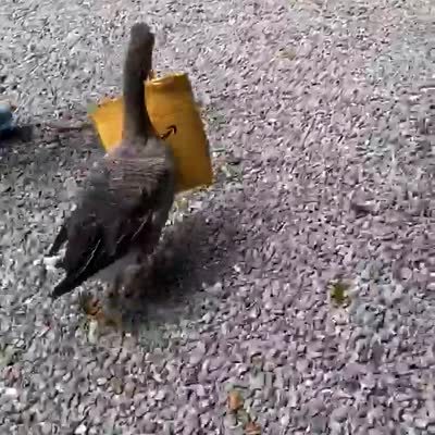 A goose bird runs away from two young girls and their mother with an Amazon package in the yard. The bird then drops the package for the woman behind the camera when she calls it to come.