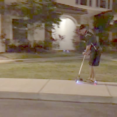 Teen boy rides razor scooter down steep road. Falls off and crashes hard on his face
