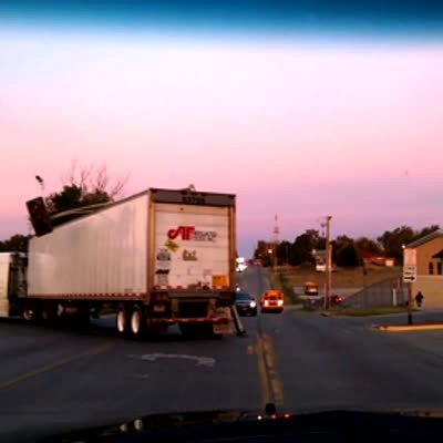 A man drives a car on a highway and is almost cut off by a Mack truck. He slams on the brakes and a fire extinguisher goes off, filling the man's car with white retardant. Split screen video with dash cam angle of road ahead.