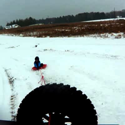 A man drives a car through a snowy road and pulls a young boy on a sled behind the car. A tot boy tries to jump onto the sled as it slides down the road, but hits the young boy and they both fall off.