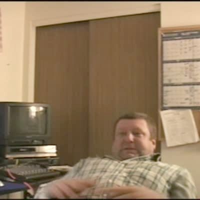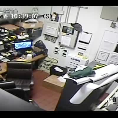 A surveillance camera shows a man sitting at a desk in a wheeled chair. He tries to get a bag of chips from the top of his desk without getting up from the chair, and the chair topples over and he falls backwards. Office. Work. No Audio