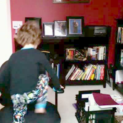 A young boy dances on a desk chair like a monkey. A man roars at the boy in the background. The boy screams and jumps off the chair. Pranks.
