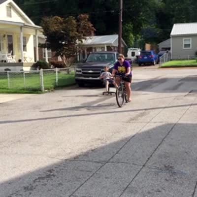 Woman rides a bike down a road, pulling another woman sitting in a rolling office chair. The woman in the chair crashes and falls out on the curb of the road onto a sidewalk, by a mailbox.