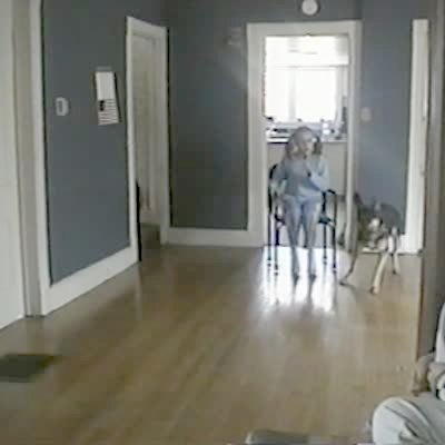 Dog pulls teen girl in roller chair; she slams into wall and falls off