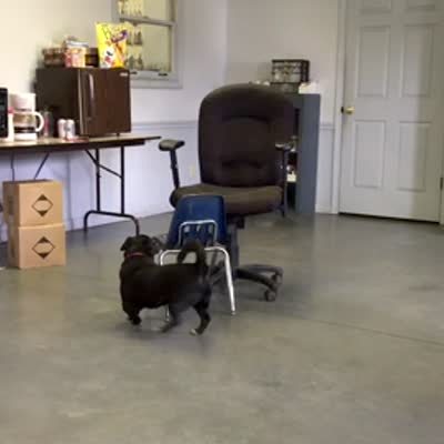 "Chair of the Dog" A dog walks under a chair that he moves with his back. He brings the smaller chair next to a larger chair and climbs on the smaller chair to get on to the larger chair in an office.