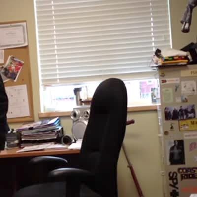 A man in an office gets pranked. He sits on his chair and an air horn goes off at 0:30.