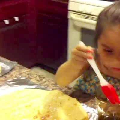 A tot girl spreads oil on pizza dough, looks up, and sneezes on it at :18.