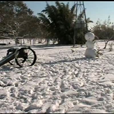 Family blows up snowman with old fashioned cannon in big yard. Winter.