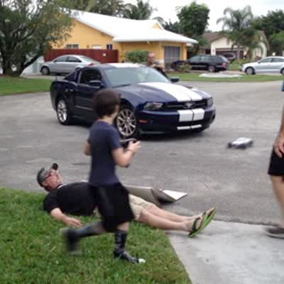 A young boy drives a remote controlled car up a ramp on his father's stomach then the car goes right into the man's face full speed.