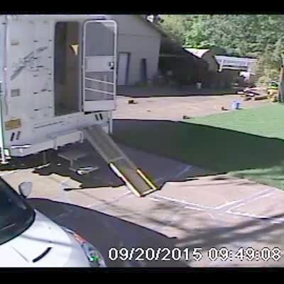 A woman steps off the back of a camper truck van and slips, spins, and falls on her face and side then walks away with her hand over her teeth. Security footage.