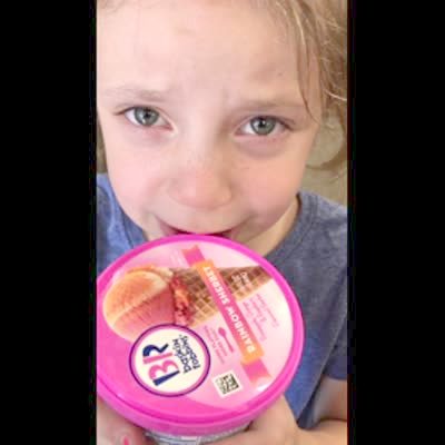 A young girl cries to her father in the living room while her lip is stuck to the side of a frozen container of ice cream after she tries to open it with her mouth.