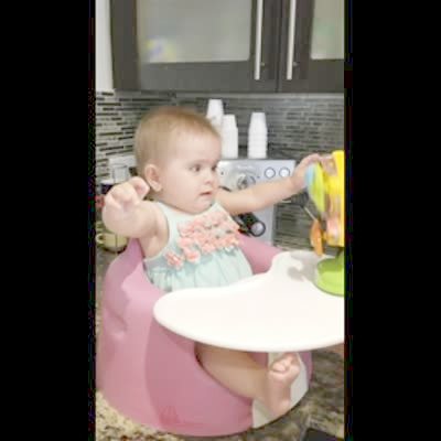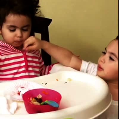 Two young girls do the Borrowed Hands challenge, and they each yell at the other to move over while they sit down in a chair. Then the young girl in the back pushes a cupcake into the front girl's face and gets frosting all over her. They try to open a bottle of water in the front young girl's mouth, then the front girl uses her hands to open it.