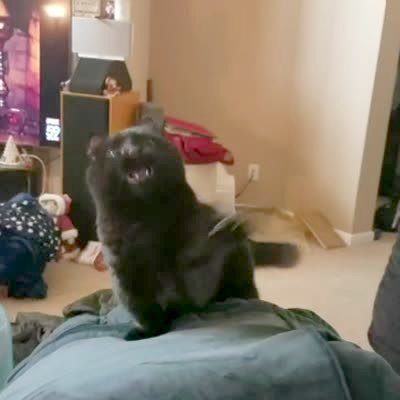 Two cats watch as a man spins a toy in the living room, one with its mouth open.