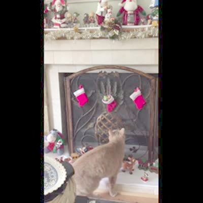 An orange cat pulls down A Christmas stocking at home and pulls the entire fire place grate down on top of it.