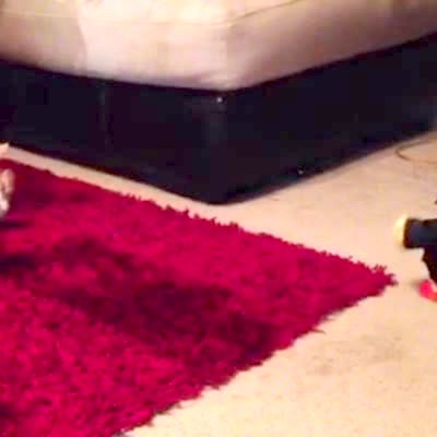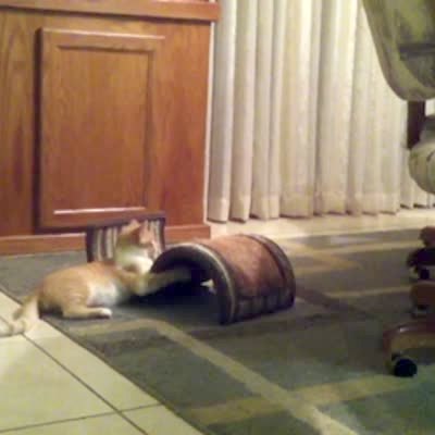 Orange kitten hides in a laundry basket. Man throws clothes at the basket & each time the cat jumps up, does a flip, tries to attack the clothes.