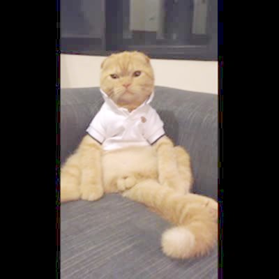 An orange cat in a polo shirt sits up on a couch and looks around.