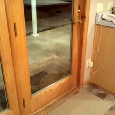 A fat orange cat chases a black cat through a cat door and gets stuck indoors.