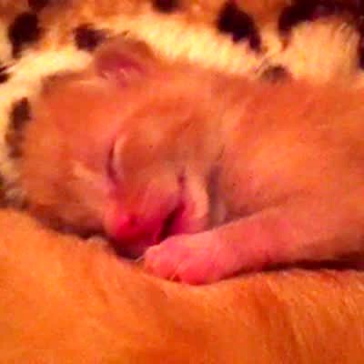 An orange and white cat bites down fast and sticks tongue out while it gets its butt rubbed.