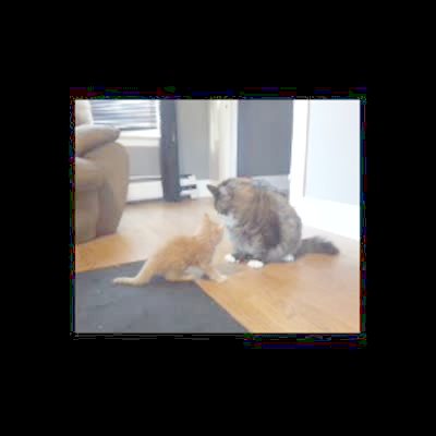 An orange kitten cat attacks a large cat at home that shoves it away.