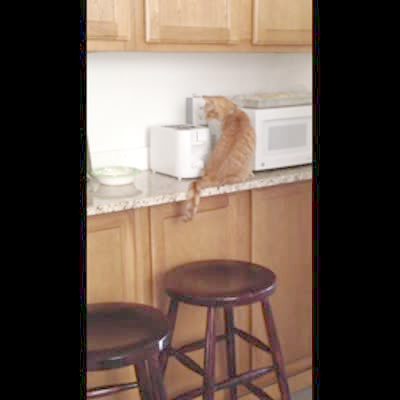 An orange tabby cat sniffs at a toaster on a kitchen counter indoors when the toast pops up and the cat jumps and falls off the counter and onto the floor.