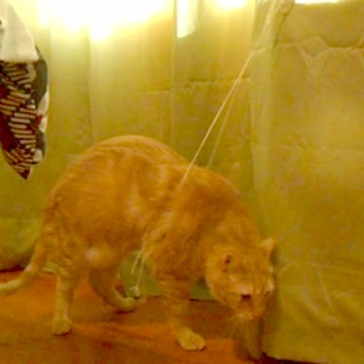Orange cat is distracted by/ scared of a moving bird toy. Owner grabs cat. Cat jumps to camera. scare