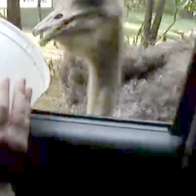 A man holds his hand out of a car and feeds an emu some pellets. The man says, "Ow!" each time the emu pecks at his hand. The ostrich then goes to teh front window and pokes his head in but a woman screams as she asks someone to close the window. A young boy asks her to stop because he can't see the emu.