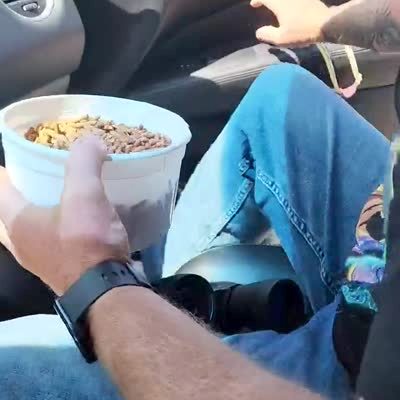 A senior man in a drive-thru safari holds a bucket of dry food out his car window for an ostrich to eat. The giant bird knocks the bowl away and spills the kibble all over the inside of the car.