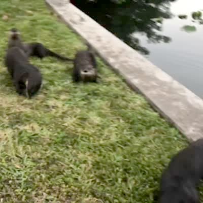 A group of otters walk next to the water at a park and a man asks the otters to stop for a group picture. The otters stand still and pose, and the man says it was a good picture.