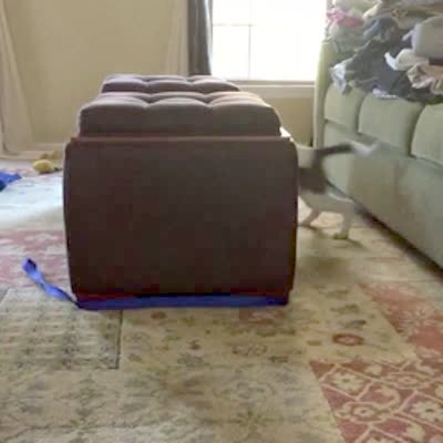 Puppy falls off ottoman and drops out of sight. dog