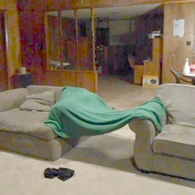 A woman sets up a camera to try and scare someone in a living room but she steps off of the couch and wipes out onto the ottoman. Social media video.