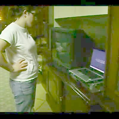 Teen girl watches scary computer video, a friend jumps out of a cupboard and scares her. Practical joke.
