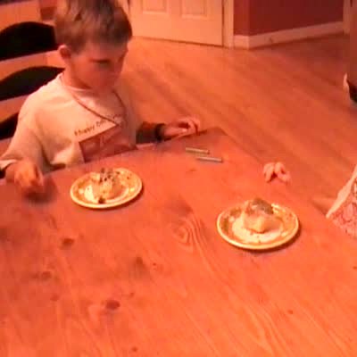 A mother plays a prank on her two young sons, giving one of the boys frozen mashed potatoes and the other refried beans that have been frozen in the shape of ice cream.
