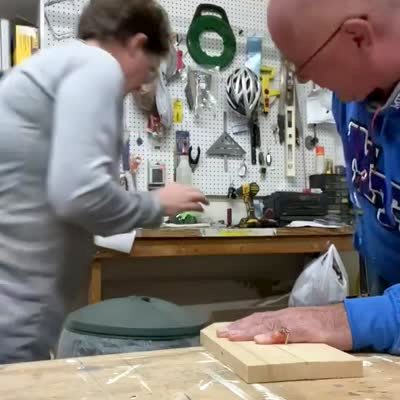 A man tricks his wife by pretending he's stapled his finger into a piece of wood in the garage. She tries to pull the staple out and asks if it's in his bone. She says she can't do it then he moves his hand away and laughs. Prank. Practical joke.