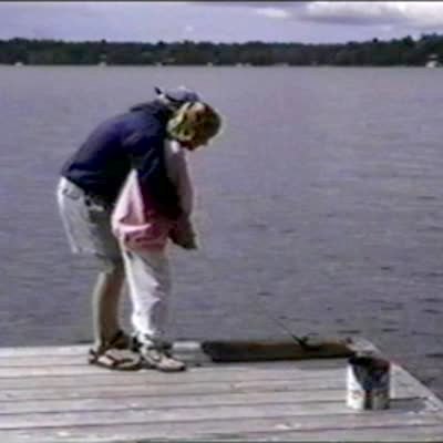 A senior man stands in a lake and tries to climb into a boat and falls backwards into the water and a woman laughs hysterically as she films.