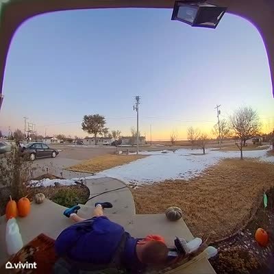 A man trips and falls as he delivers a package on a porch. Security footage.