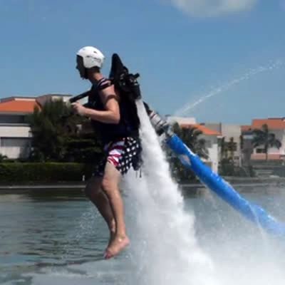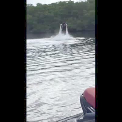 A man rides a water jet pack and it flips over and he splashes into the water. Video has no sound.