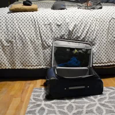 A man packs a suitcase and asks if there is anything else he needs. A dog walks over and sits inside the suitcase.
