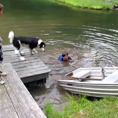 A boy falls out of a small boat into water as he tries to get help out from his family.