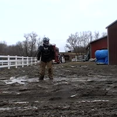 2 adults men put on football pads and run through a shed. Destruction. Boneheads.