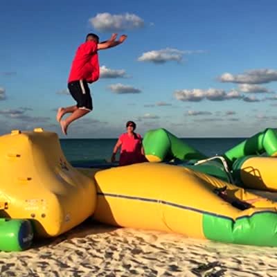 A man jumps on large air pad to launch a woman in the air and she lands hard on the beach sand.