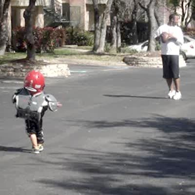 In a parking lot a man throws a football at a tot boy wearing oversized football pads. Ball hits boy on the head (helmet), boy falls down onto pavement.