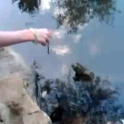 Young boy holds a worm over a pond by a frog on a lily pad. The frog jumps up, bites the worm, and bites the boy's finger. The boy screams and the frog falls off.